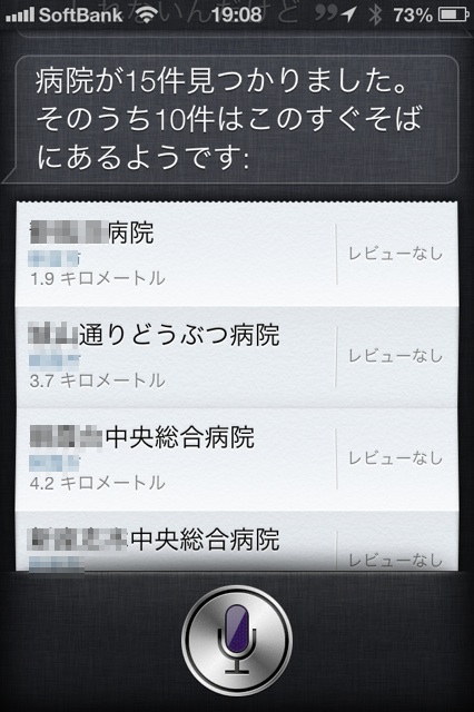 Siriにとんでもない病院を紹介された件について Siri Twitter Facebook はてブ Google+ Pocket LINE 2013.02.18 聞いてください。Siriに動物扱いされました。最近の寒さで体調を崩したのか、お腹の調子が悪く、病院を探そうと思ったんですよ。そういえば、iOS6からSiriで近くのお店や施設を探してくれるようなったので試してみたんです。 お腹痛いから病院さがしてくれって。 そしたら… いやー… 2番目に表示されてるのってどう見ても動物病院ですから。 ってかどうぶつ病院ってご丁寧に書いてあるのに! ちょっとショックな出来事でした。